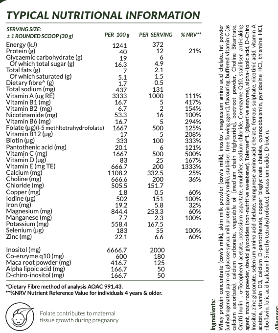 Advanced Fertility Support is a delicious All-In-One high protein shake including a complete range of targeted prenatal vitamins and minerals, myo-inositol, co-enzyme Q10, alpha lipoic acid and Maca root- all to support better oocyte (egg) quality. The product is scientifically designed to ensure that optimal quantities of the various nutrients are included. The product does not contain any added sugars, artificial colourants or artificial sweeteners. It is ideal for a snack or light breakfast.